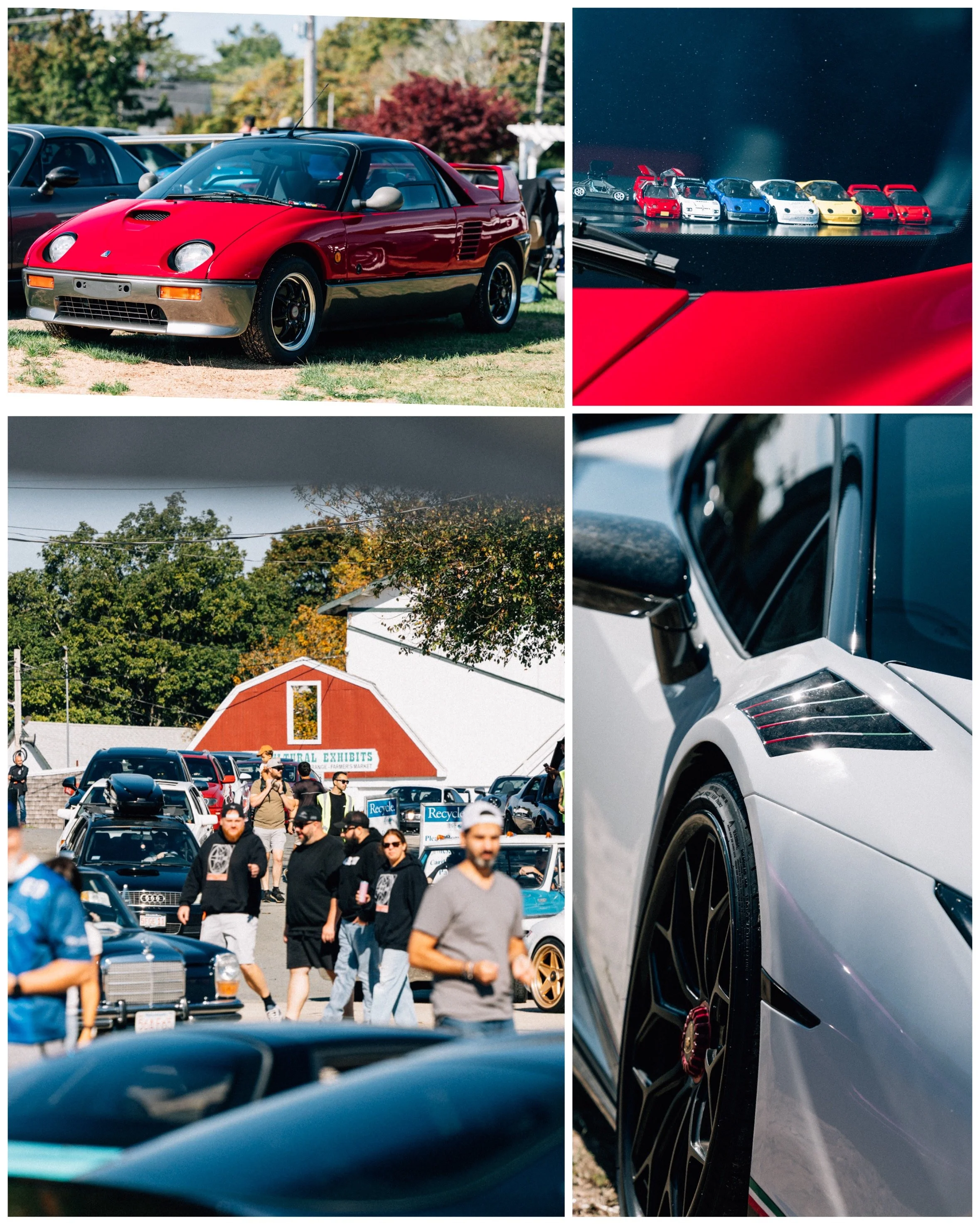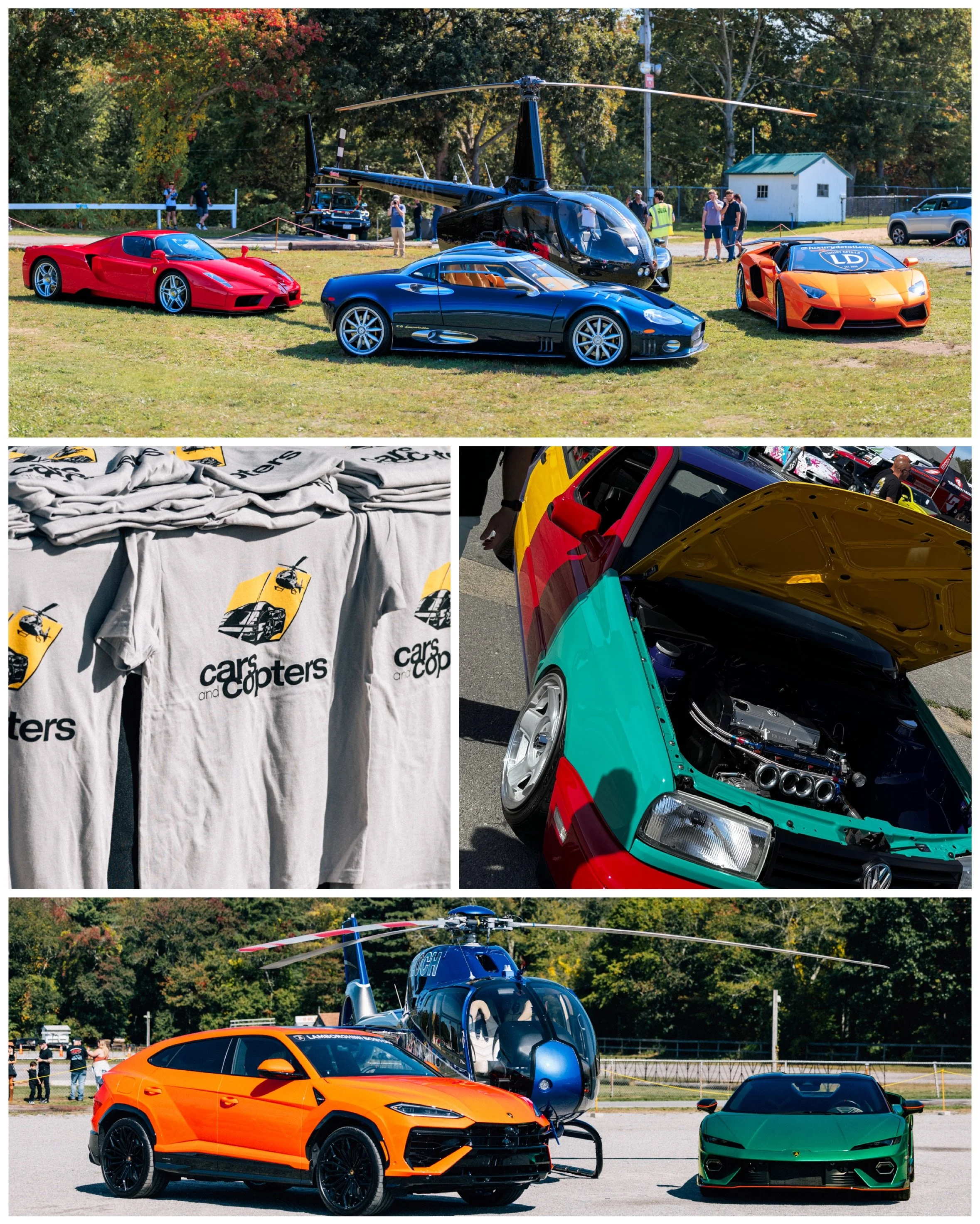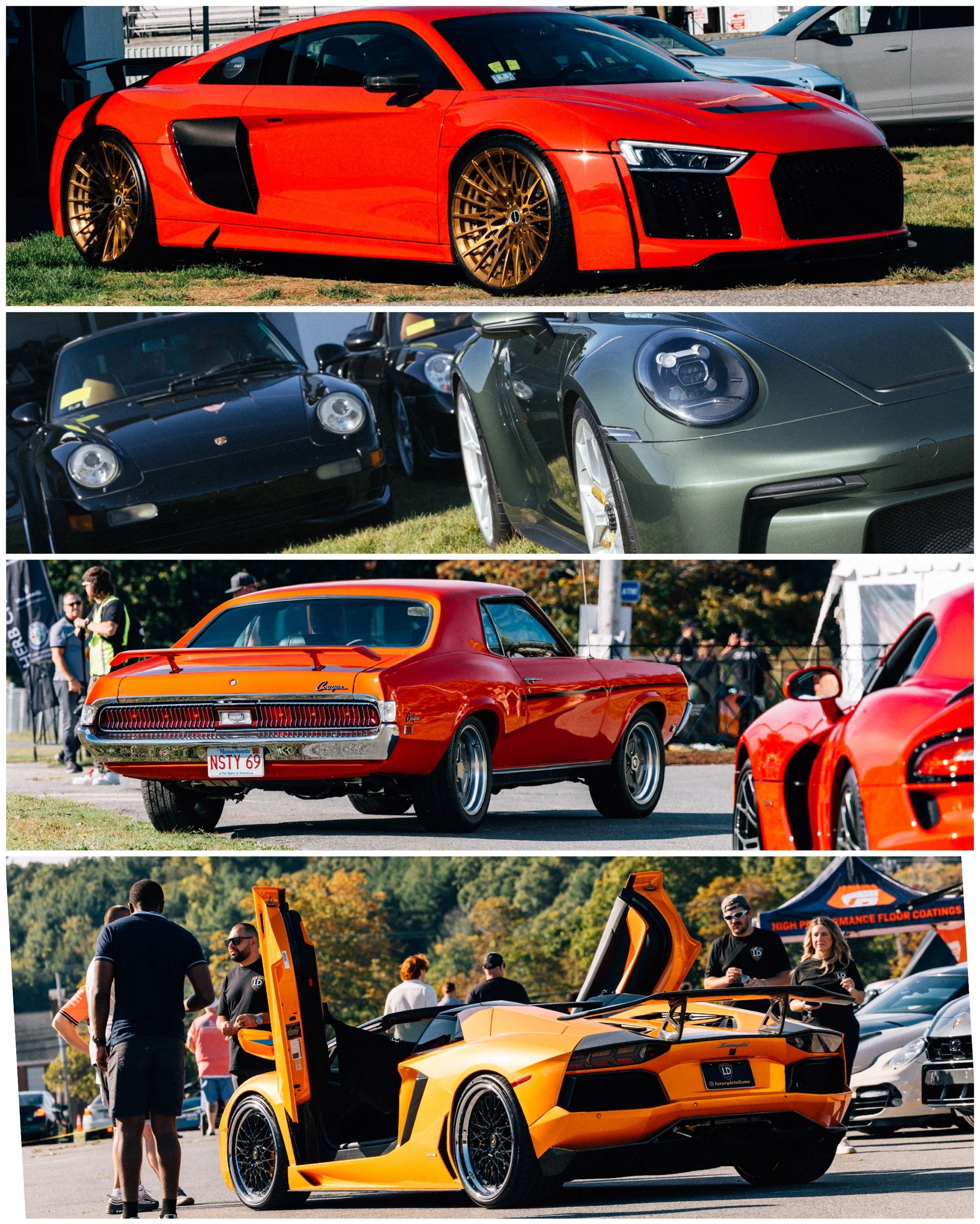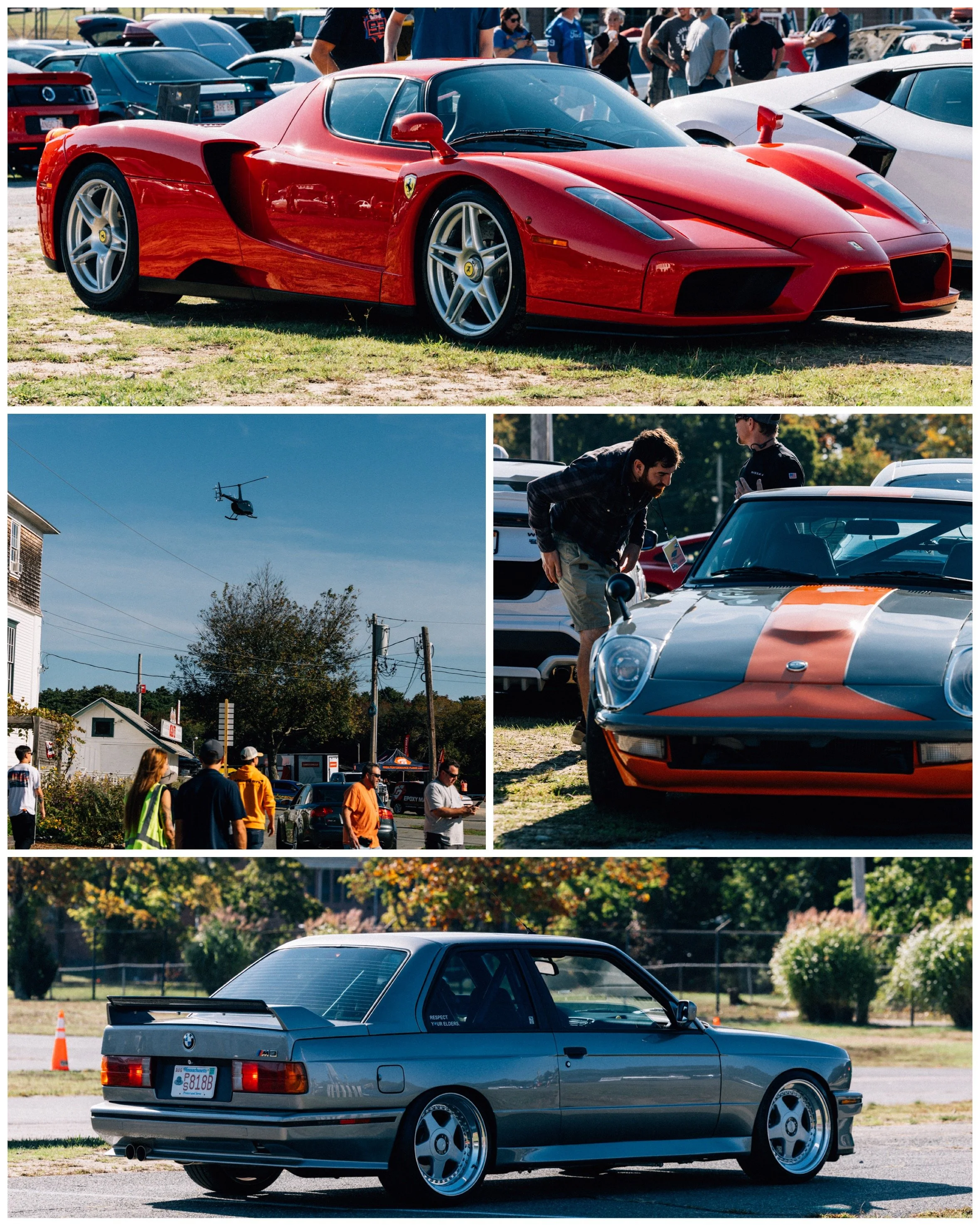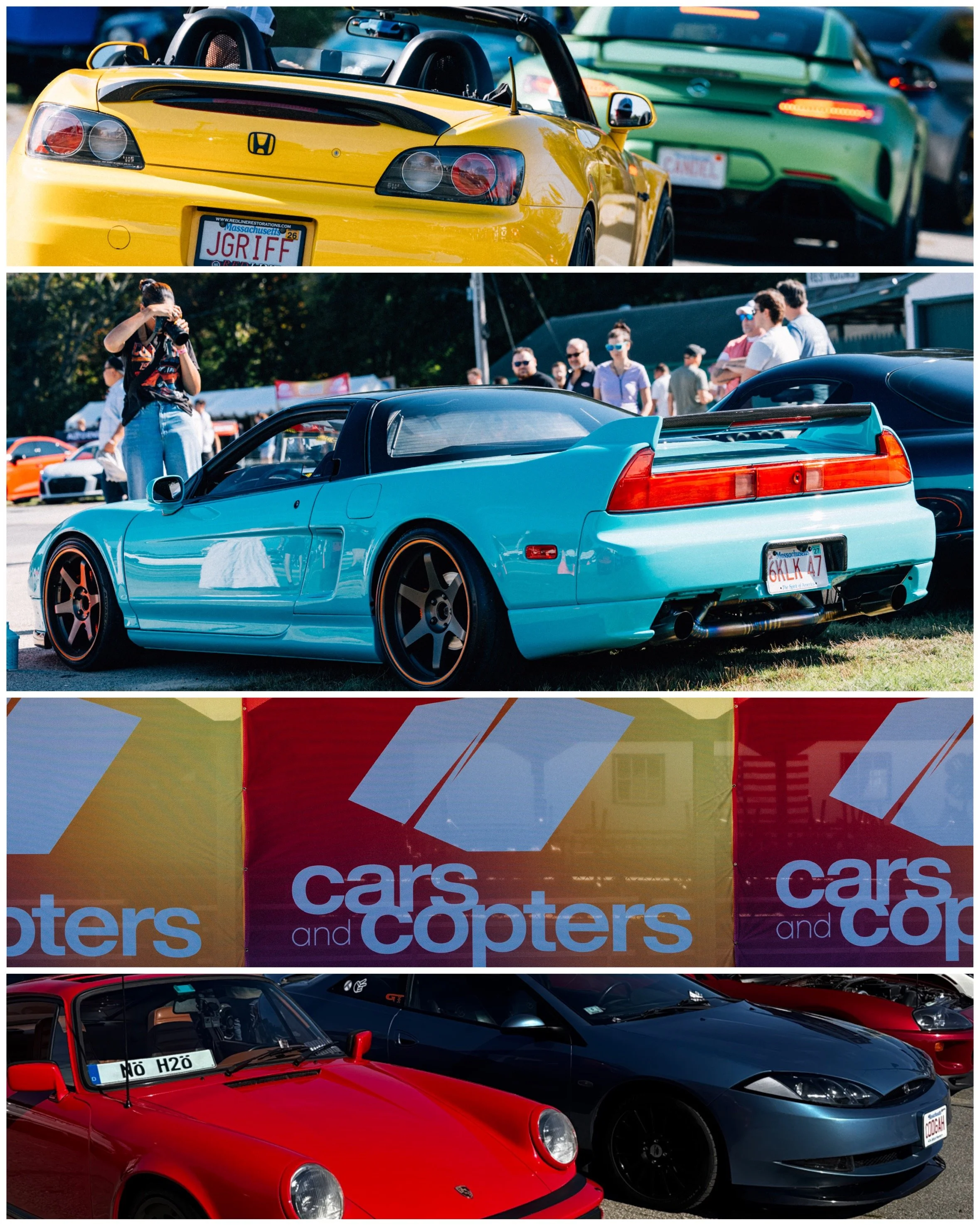 The graphic element is taken from the events past location of Plymouth airport and uses the Plymouth Rock as an abstract shape, while also showing the leading edges of helicopter blades as the split of the rock. Text and colors were inspired by early 90’s and early 2000’s electronic music often associated with the car scene at the time along with bright colors and chromatic shifting paints seen on custom builds.